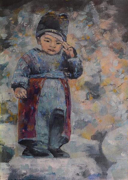 Le tablier. Peinture Acrylique. Jeune chinois en costume de fête. Embarras et fierté Vendu